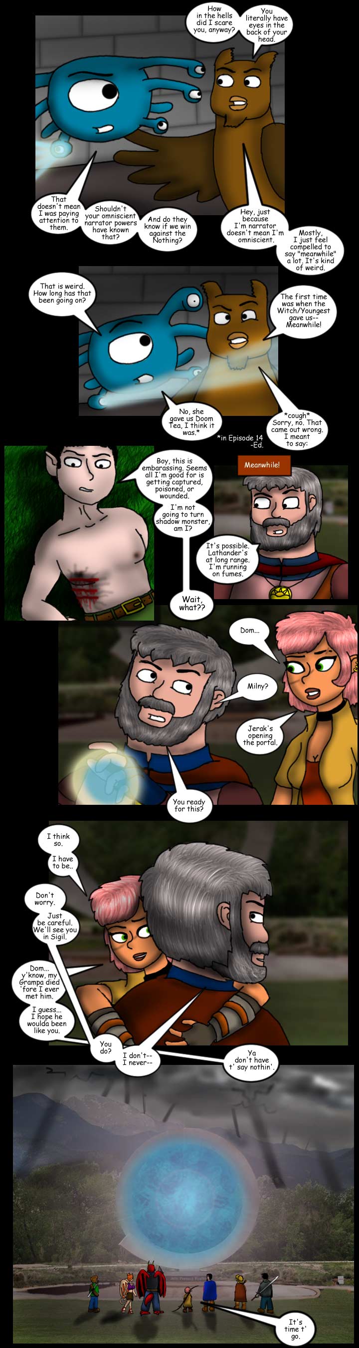 On another note, looking back at Episode 14 (since this one referenced it for being what I'm pretty sure was the first "meanwhile"), wow. My artwork was pretty darn bad, even discounting all that black and white. Out of curiousity, who all out there was reading back then? And how did you stand it? ;)