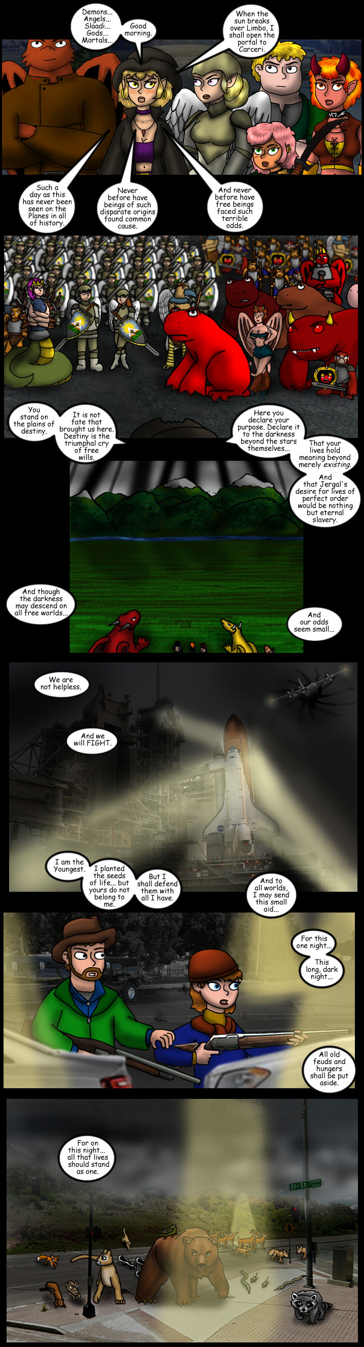 On that note, I used to wonder why the plot of so many shows and movies involve preventing war, instead of, y'know, having one and all the exciting action scenes that come with. Oh sure, you might say morality, or saving lives, or whatever, but the REAL reason is because armies are danged time consuming to draw (or, y'know, expensive with live