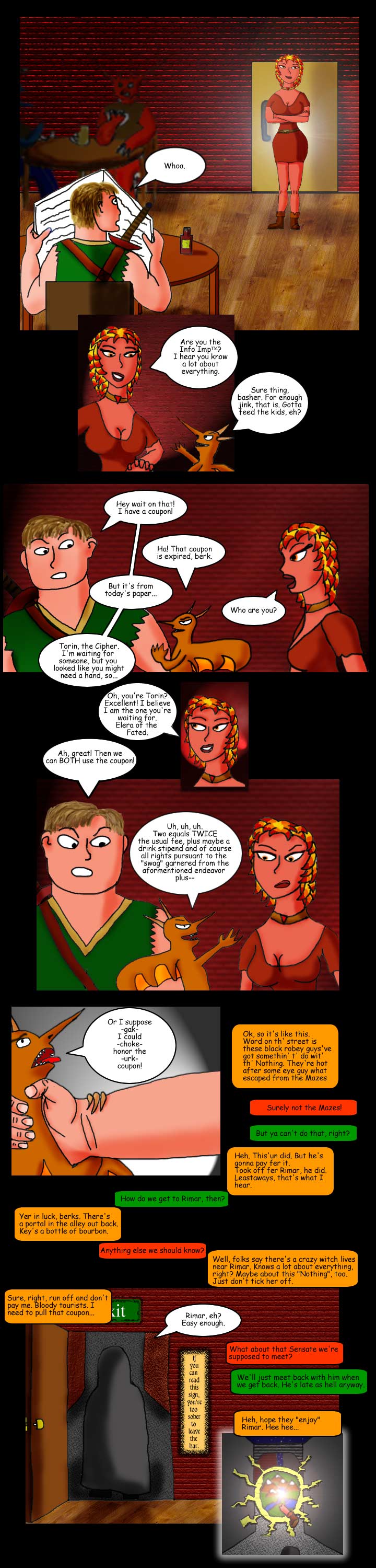 The amusing thing I noticed in doing this comic is that I've consistenly been showing Torin with a sword strapped to his back, but have never actually drawn said strap. I guess it's just